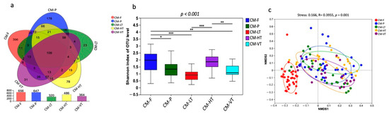 The gut bacterial composition of C. megacephala exhibited substantial variations under different experimental conditions. (a) Venn diagram showed the OTUs shared by CM-F, CM-P, LT, HT, and VT groups; (b) The Shannon diversity index showed the substantial variations in the gut bacterial composition of C. megacephala under different experimental conditions (* p < 0.05, ** p < 0.01, *** p < 0.001); (c) The non-metric multidimensional scaling (NMDS) with binary Jaccard distance showed the significant differences in the gut bacterial composition of C. megacephala between different experimental conditions (stress: 0.166, R = 0.3955, p = 0.001). Abbreviations: OTU: Operational Taxonomic Unit; CM-F: C. megacephala fed with wheat bran plus fish; CM-P: C. megacephala fed with pig lungs; CM-LT: C. megacephala maintained at low temperature; CM-HT: C. megacephala maintained at high temperature; CM-VT: C. megacephala maintained at variable temperature.