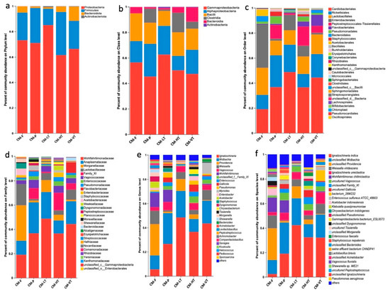 The dominant gut microbiota under all experimental conditions. (a) Bar plot for the percent of community abundance of the dominant phyla between different feeding sources and temperatures; (b) Bar plot for the percent of community abundance of the dominant class between different feeding sources and temperatures; (c) Bar plot for the percent of community abundance of the dominant order between different feeding sources and temperatures; (d) Bar plot for the percent of community abundance of the dominant family between different feeding sources and temperatures; (e) Bar plot for the percent of community abundance of the dominant genus between different feeding sources and temperatures; (f) Bar plot for the percent of community abundance of the dominant species between different feeding sources and temperatures. Abbreviations: CM-F: C. megacephala fed with wheat bran plus fish; CM-P: C. megacephala fed with pig lungs; CM-LT: C. megacephala maintained at low temperature; CM-HT: C. megacephala maintained at high temperature; CM-VT: C. megacephala maintained at variable temperature.