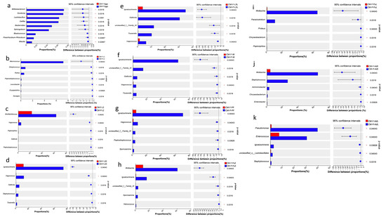 The significant differences in the proportion of bacterial taxa between different feeding sources (Wilcoxon rank-sum, 95% confidence intervals). (a) The proportion of bacterial taxa (%) at the egg stage (Eggs) in CMP and CMF; (b) The proportion of bacterial taxa (%) at the first larvae instar (L1) in CMP and CMF; (c) The proportion of bacterial taxa (%) at the second larvae instar (L2) in CMP and CMF; (d–f) The proportion of bacterial taxa (%) at the third larvae instar (including L3E, L3L, and Wd stage) in CMP and CMF; (g–i) The proportion of bacterial taxa (%) at the pupal stage (including PP and PuL) in CMP and CMF; (j,k) The proportion of bacterial taxa (%) at the adult stage (including AdE and AdL) in CMP and CMF. Abbreviations: CM-F: C. megacephala fed with wheat bran plus fish; CM-P: C. megacephala fed with pig lungs; L1: the first larvae instar of C. megacephala; L2: the second larvae instar of C. megacephala; L3E: the third larval early stage of C. megacephala; L3L: the third larval late stage of C. megacephala; W: Wandering stage of C. megacephala; PP: the prepupal stage of C. megacephala; PuE: the pupae early stage of C. megacephala; PuL: the pupae late stage of C. megacephala; AdE: the adult early stage of C. megacephala; AdL: the adult late stage of C. megacephala.