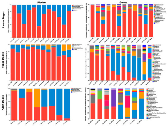 At the phylum level, the relative proportions of Proteobacteria, Firmicutes, and Bacteroidota varied according to different feeding sources (Figure 3 and Tables S4–S9). For instance, the Firmicutes phylum was more abundant in eggs collected from CMF (3.05%) compared to CMP (0.72%) (Figure 3 and Table S4). Similarly, Bacteroidota was more prevalent in CMP (4.65%) than in CMF (0.98%) during the first instar (Figure 3 and Table S5). During the second larvae instar, the Firmicutes phylum was more prevalent in CMF (26.80%) than in CMP (6.27%) (Figure 3 and Table S6). For the third larvae stage, the Bacteroidota phylum was most dominant during the third larvae late (L3L) and Wandering (WD) stages in CMF (10.54% and 24.90%, respectively) compared to CMP (0.01% and 0.02%, respectively) (Figure 3 and Table S7). During the pupal stages, Bacteroidota was most abundant in CMF (6.68%) during the prepupal stage (PP), while the Firmicutes phylum was abundant in CMP (20.37%) compared to CMF (1.27%) (Figure 3 and Table S8). During the adult stages, the Firmicutes phylum was most prevalent in CMP (54.09%) during the early adult stage (AdE), while at the late stage, it was most abundant in CMF (94.14%) compared to CMP (54.09%) (Figure 3 and Table S9).