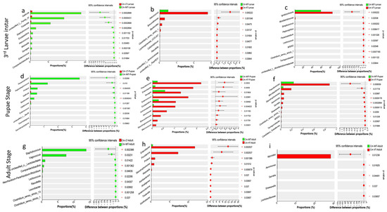 Comparative analysis revealed significant differences in the proportion of bacterial taxa across different temperatures (Wilcoxon rank-sum, 95% confidence intervals). (a–c) The proportion of bacterial taxa (%) at the third larvae instar with the low, high and variable temperatures compared to the moderate temperature, respectively; (d–f) The proportion of bacterial taxa (%) at the pupal stage with the low, high and variable temperatures compared to the moderate temperature, respectively; (g–i) The proportion of bacterial taxa (%) at the adult stage with the low, high and variable temperatures compared to the moderate temperature, respectively. Abbreviations: CM-LT: C. megacephala maintained at low temperature; CM-MT: C. megacephala maintained at moderate temperature; CM-HT: C. megacephala maintained at high temperature; CM-VT: C. megacephala maintained at variable temperature.