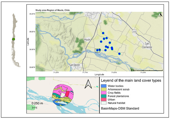 The central valley of Chile is characterized by a temperate Mediterranean climate, with dry summers and mild, rainy winters [13]. Temperatures vary from 25 to 35 °C in spring–summer (September–March) and between 3 and 13 °C in winter, with precipitation ranging from 22 to 130 mm during spring and from 300 to 900 mm in winter (June–August) [14,15]. The natural vegetation is characterized by sclerophyllous forest in the coastal mountain range and foothill of the Andes, thorn scrub (Acacia caven) mainly in the eastern part, with Nothofagus species forests mostly close to the Andes. Between these two mountains ranges, most agriculture is carried out; however, patches of natural and seminatural elements persist throughout [16]. In the last 40 years, annual field crop coverage has begun to decrease, and the coverage of export-oriented orchards and vineyards, as well as forest plantations, has increased (with a consequent 12.7–27.0% reduction per 10 years of native forests) [17].