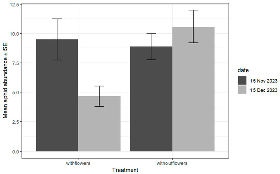 Mean number of aphids ± SE per plant at farms with and without flower strips, independent of the surrounding %SNA, for two sampling dates, f1 and f2. Significantly less aphids were found at farms with flowers during the second sampling date (date:treatment: χ2 = 20.53, df = 1, p = 5.8 × 10−6). Only significant differences were found between the 15 November and 15 December samplings and for farms with flowers according to Tukey’s test accounting for multiplicity.