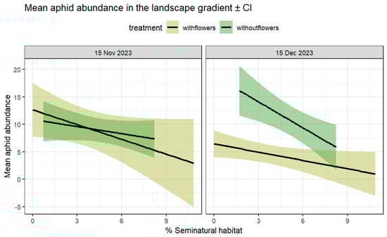 Mean number of aphids per plant in farms with and without flower strips (%SNH surrounding farms in a 1 km buffer as a continuous linear predictor). Lines represent means across samples ± 95% CI at two different sampling periods, 15 November (left) and 15 December (right), with and without flowers.