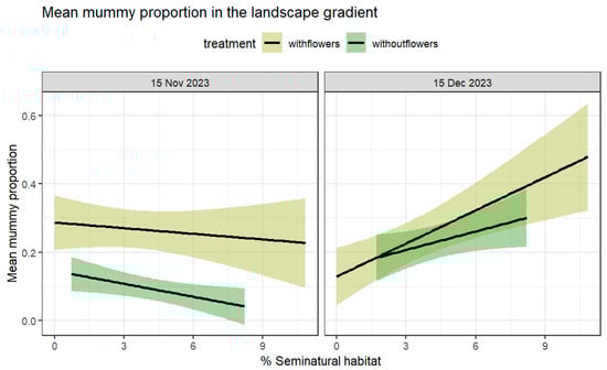 The later effect of the landscape in both treatments suggests that key resources may have been present later on in the surrounding landscape, as it significantly increased the proportion of mummies even in the absence of flowers (Table 2). The presence of surrounding native vegetation has been shown to increase the parasitoid activity and parasitism in arable fields [36]. However, after a month of flowering, it is very likely that our flower strips were not supplementing enough nectar, and the parasitoid relied more on the surrounding resources, so we only perceived a stronger effect of the landscape at this later date. Indeed, we found Raphanus raphanistrum, Brassica rapa, Capsella bursa-pastori, and Lamium amplexicaule as the main flowering annual plants surrounding the area towards the end of the season.