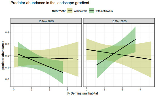 For spiders, we did not observe an increase with the presence of flower strips independent of the landscape variable, although adding plant diversity and architectural vegetation complexity may increase spider abundance according to the literature [44]. In the case of spiders, it is not clear whether they act as natural enemies; therefore, they could be responding to other prey items not studied here, potentially to some other predators. The abundance of other prey items should be included in the future, and diet analyses of the predators found here are already underway to identify the missing resources that could help explain these patterns. However, at a more observational level, farms seem to have provided favorable conditions, such as anchoring points for webs and opportunities to use different foraging methods, as suggested by [45], as different hunting guilds were observed at the farms (e.g., space web weavers, sheet web weavers, and other hunters).