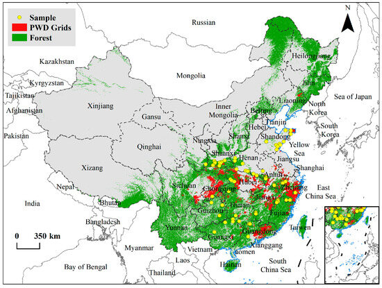 Grids for pine wilt disease 1986–2018, sample survey sites, and forest vegetation distribution in China, 2018 [33].