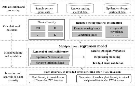 Remote sensing spectral information of the sampling area was extracted and modeled with four diversity indices of the sample sites as a means of inverting the plant diversity of the PWD invasion area in China. Based on the considerations of the resolution, time span, and its open-source nature, we finally selected data from the Landsat series, which provides multispectral data in the blue, green, and red visible bands, one near-infrared band, and two short-wave infrared bands, with a spatial resolution of 30 m. Specifically, in this study, we downloaded Level 2, Collection 2, and Tier 1 series datasets of Landsat 5 (1986–1999) and Landsat 7 (2000–2022) from the Google Earth Engine platform https://earthengine.google.com/ (accessed on 21 September 2023). We then analyzed data according to the following flowchart (Figure 2).