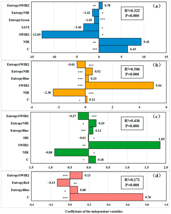 The regression models showed that the entropy texture features of the gray-level covariance matrix were significantly correlated with the four species diversity indices (Figure 3). Specifically, the texture feature entropy calculated from all green (EntropyGreen), near-infrared (EntropyNIR), and short-wave infrared (SWIR2) (EntropySWIR2) bands significantly correlated with MR (p < 0.05 for all, Figure 3a); EntropyBlue, EntropyNIR, and EntropySWIR2 were significant for H (p < 0.001 for all, Figure 3b) and J (p < 0.05 for all, Figure 3c); and EntropySWIR2, EntropyRed, and EntropyBlue were significant for D (p < 0.05 for all, Figure 3d).