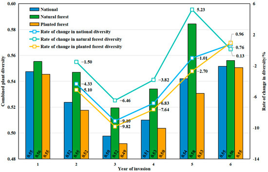 After the PWD invasion, Chinese natural and planted forests’ year-by-year average ComDiv and rate of change (%). (The rate of change is calculated based on the plant diversity level in the first year of invasion).