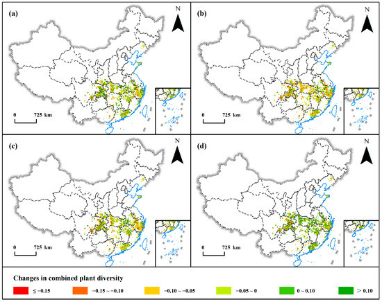 (a–d) represent the distribution of changes in the ComDiv in China after one year, two years, three years, and four years of PWD invasion, respectively.