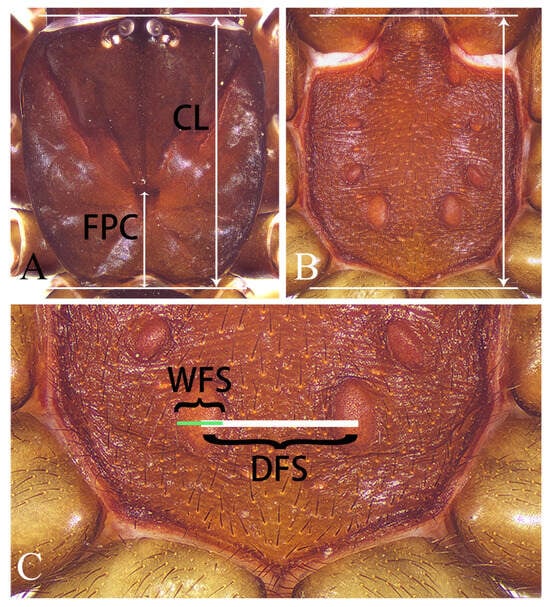 Illustration of selected measurement methods. (A) illustration of R1, the ratio of the distance between the fovea and the posterior end of the carapace (FPC) to the total length of the carapace (CL); (B) illustration of the sternum length measurement (including the fused labium); (C) illustration of R2, the ratio of the distance between the centers of the fourth pair of sigilla (DFS) to the width of the fourth sigilla (WFS).
