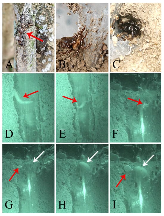 Most behavioral and natural history images of Atypus spiders were captured using a Canon EOS R7 (Canon Inc., Tokyo, Japan), while a small number of images documenting nocturnal activities were taken with a SONY FDR-AX60 (Sony Corporation, Tokyo, Japan) utilizing its night vision function. Photographs inside the purse-web were taken using a DY8-M5-V26 industrial endoscope (Shenzhen Daying Technology Co., Ltd., Shenzhen, China). The specific behavioral details were recorded through long-term observations, while the timing and duration of various life-history stages were documented based on extended monitoring and statistical records. The timings reported in this study represent general patterns derived from our field collections in China (primarily in southern China) and laboratory observations.