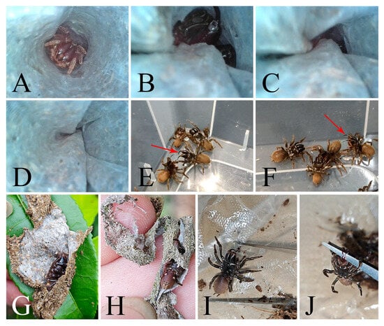 In mid-May in southern China, male specimens undergo their final molt, marking the onset of sexual maturity. During this period, mature males can be collected in the field, along with some freshly molted, incompletely developed males are also found. In natural settings, males reach maturity between mid-May and early June and subsequently leave their webs to seek females for mating. By mid- to late-June, a portion of the females (although no specific data can be provided) have already mated, and mature males can rarely or hardly be collected in the field. Additionally, during this period, some tubes were found empty, further indicating the males’ departure. In laboratory conditions, collected females, regardless of their maturity, burrow and weave new purse-webs. However, mature males exhibit different behavior: they no longer burrow or weave complete purse-webs, although they retain the ability to produce silk. Interestingly, if a pit is dug in advance under laboratory conditions, mature males will spin silk and weave very thin, tubular webs within the pit (Figure 14L). It is noteworthy that these webs do not extend upwards beyond the excavation plane. These behaviors of mature male spiders are believed to be energy-saving strategies for the upcoming mating season. Furthermore, our observations indicate that all male spiders cease feeding after reaching maturity.