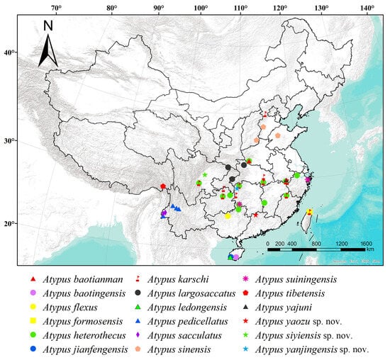 Distribution map of Atypus species in China, including the known species and the three new species described in this study.