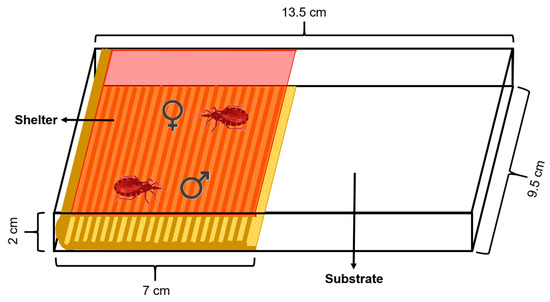 The experimental arena used consisted of a rectangular acrylic box (13.5 cm length × 9.5 cm width × 2 cm height) covered by a removable lid. The floor was covered with a piece of filter paper as the substrate which was changed between assays. An artificial shelter was placed on the arena over the substrate. This shelter (7 cm length × 9.5 cm width × 2 cm height) consisted of a piece of corrugated cardboard as the floor and a piece of red transparent acetate attached to it that functioned as a ceiling, allowing mating inside the shelter to be video-recorded (Figure 1). Rhodnius prolixus cannot perceive red light, so the shelter was assumed to be mostly dark for these insects [39]. The area of the arena had two equal halves, one occupied with the shelter and the other one by the substrate. The shelter was accessible to the insects only from the front but not from the sides, minimizing the entrance of light. Additionally, the lid covering the shelter prevented the insects from walking over it.