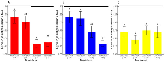Number of matings for each time interval over ten days (mean ± SE) under (A) L/D, (B) D/D, and (C) L/L regimes. For each photoperiod, different lowercase letters represent significant differences between time intervals (p < 0.05). Dark and white horizontal bars indicate the periods of the lights being off and on, respectively. EP: early photophase. LP: late photophase. ES: early scotophase. LS: late scotophase. ESD: early subjective day. LSD: late subjective day. ESN: early subjective night. LSN: late subjective night. (n = 24 for each photoperiod).