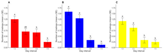 Number of matings for each day interval (mean ± SE) under (A) L/D, (B) D/D, and (C) L/L regimes. For each photoperiod, different lowercase letters represent significant differences between time intervals (p < 0.05) (n = 24 for each photoperiod).