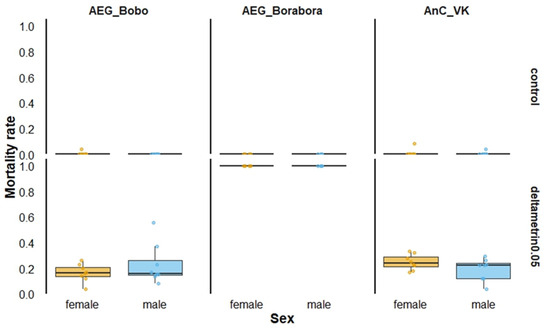 Twenty-four-hour mortality rates according to mosquito strain sex when exposed to 0.05% deltamethrin in World Health Organization tubes. AEG_Bobo = Aedes aegypti Bobo strain; AEG_Borabora = Aedes aegypti Borabora strain; AnC_VK = Anopheles coluzzii laboratory-resistant strain from Vallee du Kou. Controls were mosquitoes that were not exposed to deltamethrin-impregnated papers.