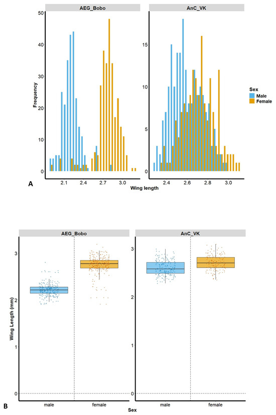 The size distribution frequency shows a greater separation between males and females in Ae. aegypti Bobo, and more overlapping lengths in An. coluzzii VK (Figure 2A). A total of male (n = 250) and female (n = 287) Ae. aegypti Bobo, as well as male (n = 197) and female (n = 158) An. coluzzii VK mosquitoes, were assessed. Female wing length was significantly greater than that of the males in Ae. aegypti Bobo (female: 2.75 ± 0.19 mm; male: 2.22 ± 0.14 mm, Kruskal–Wallis test: H = 342.184, p < 0.001) and in An. coluzzii VK (female: 2.71 ± 0.16 mm; male: 2.6 ± 0.15 mm, Kruskal–Wallis test: H = 37.443, p < 0.001) (Figure 2B).