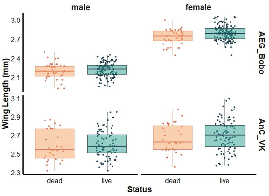 For female mosquitoes, a marginally greater wing length was observed in live than dead female Ae. aegypti Bobo (live: 2.77 ± 0.19 mm and dead: 2.74 ± 0.13 mm, Wilcoxon test, p = 0.04), with no significant size differences observed between live and dead males (live: 2.21 ± 0.11 mm and dead: 2.20 ± 0.12 mm, Wilcoxon test, p = 0.59) (Figure 3). The mean wing lengths of live and dead female An. coluzzii were 2.70 ± 0.16 mm and 2.67 ± 0.15 mm (Wilcoxon test, p = 0.37), respectively, and 2.60 ± 0.14 mm and 2.59 ± 0.16 mm (Wilcoxon test, p = 0.72) for live and dead males, respectively (Figure 3).