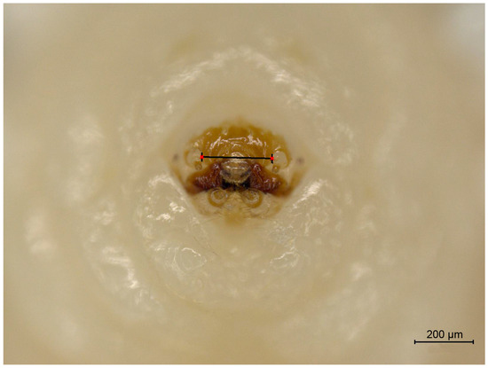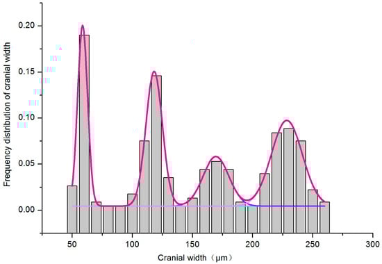 From the appearance of oval white eggshells in the Petri dishes, batches of cowpeas were soaked in 100% ethanol every three days, with larvae collected until a substantial number of pupae emerged in the cowpeas. A total of 226 larvae were collected. We photographed the front view of the head of each larval specimen and measured the cranial width from the images (Figure 2; Supplementary Material S1). The peak fitting module of Origin 8.1 (OriginLab, Northampton, MA, USA) was used to perform the multi-peak fitting of larva cranial width based on a Gaussian function, aiming to maximize R2 to as close to 1 as possible. The solve function of Matlab R2014a (MathWorks, Natick, MA, USA) was used to compute the intersection point of two adjacent Gaussian functions, representing the boundary value of front width for two sequential instars, as well as the coefficient of variation and misclassification probability.