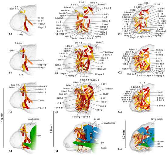 Thoracic musculature and other organs of larval Callosobruchus maculatus in sagittal section. (A1–A4) first instar; (B1–B4) second instar; (C1–C4) third instar. The numbers 1–4 indicate a gradual movement from the lateral position of the thorax to the proximal position.