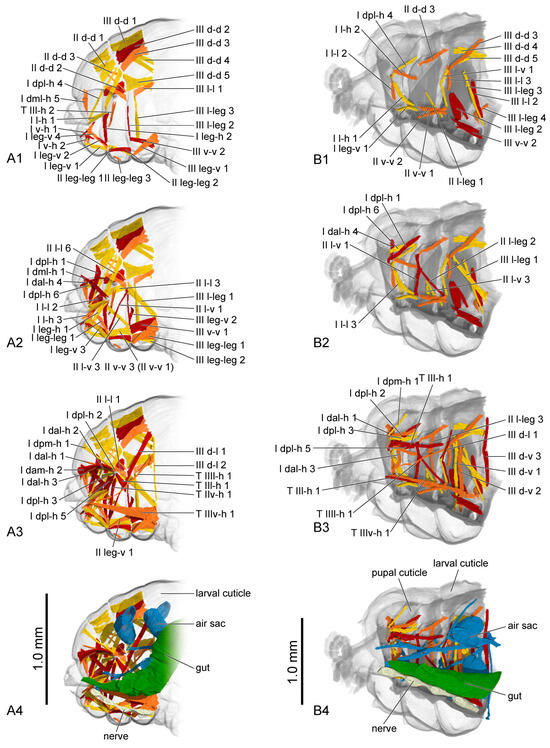 The muscles in the pupal stage were described in the same manner as those in the larval stage (Figure 10 (A1–A3,B1–B3); Figure 11 (A1–A3,B1–B3)). The presence or absence of muscles in each developmental stage was recorded (Table 7). Each muscle at each stage during pupal development is described in detail, including its length and width (Supplementary Materials S4 and S5).