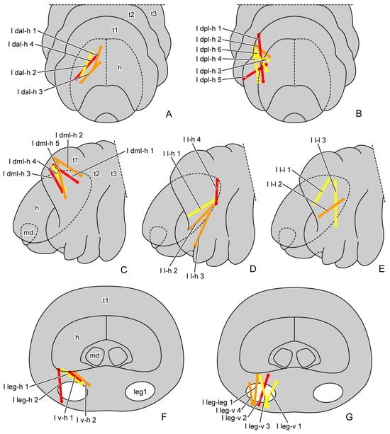 General locations of prothoracic muscles of larval Callosobruchus maculatus. (A,B) front view; (C–E) lateral view from outside; (F,G) rear view from inside. Abbreviations: h—head; md—mandible; leg1—proleg; t1/2/3—pro-/meso-/metathorax.