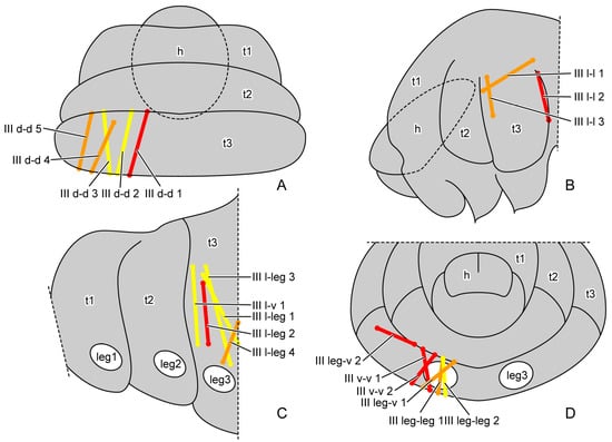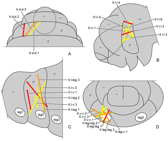General locations of mesothoracic muscles of larval Callosobruchus maculatus. (A) dorsal view from outside; (B,C) lateral view from outside; (D) rear view from inside. Abbreviations: h—head; leg1/2/3—pro-/mid-/hindleg; t1/2/3—pro-/meso-/metathorax.