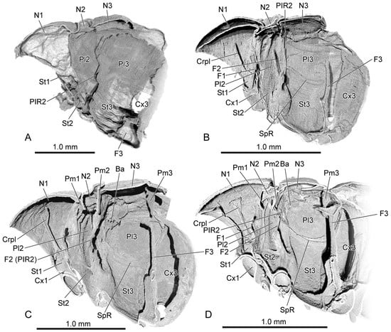 The endoskeleton of pupal and adult Callosobruchus maculatus. (A) initial pupal stage; (B) middle pupal stage; (C) late pupal stage; (D) adult. Abbreviations: Ba—basalar sclerite; Crpl—cryptopleuron; Cx1/3—pro-/metacoxal; F1/2/3—pro-/meso-/metathoracic furca; N1/2/3—pro-/meso-/metanotum; Pl2/3—meso-/metapleuron; PlR2—mesopleural ridge; Pm1/2/3—pro-/meso-/metaphragma; SpR—sternopleural ridge; St1/2/3—pro-/meso-/metasternum.