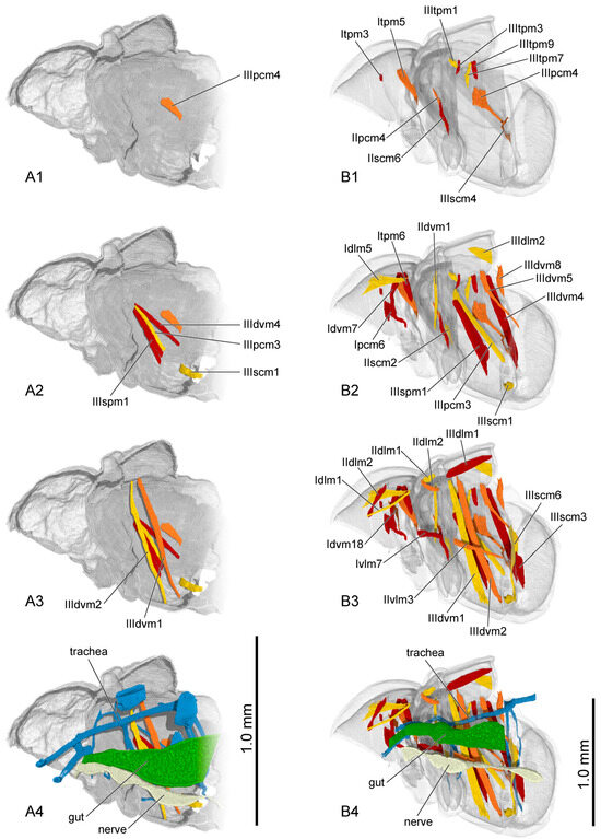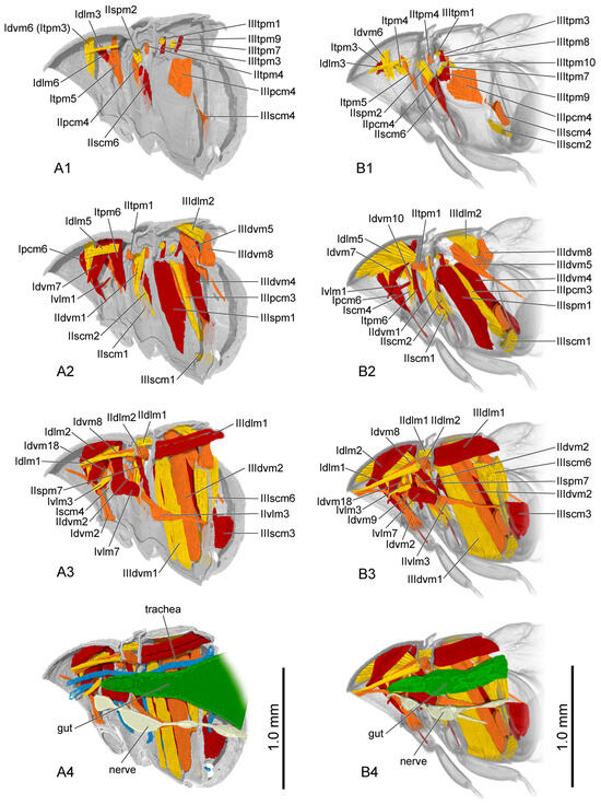 Thoracic musculature and other organs of pupal Callosobruchus maculatus in sagittal section. (A1–A4) late pupal stage; (B1–B4) adult. The numbers 1–4 indicate a gradual movement from the lateral position of the thorax to the proximal position. Itpm3 is hidden by Idvm6 in (A1).