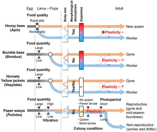 Caste is determined before and/or after emergence. In species with morphological and physiological dimorphism between castes, castes begin to differentiate during the larval stage and determine their morphology before emergence. This means that there is a lack of plasticity in caste determination during the adult stage. In advanced and highly eusocial Hymenoptera, caste differentiation is promoted by food quality (e.g., royal jelly) and quantity during the larval stage, and caste is already determined at emergence [2,3,10,25,26]. However, in other Hymenoptera, especially those with an annual colony cycle, such as Polistes wasps and bumble bees, the mechanism of caste differentiation or determination has not yet been fully elucidated.
