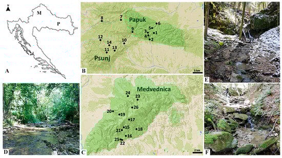 Study area. (A). Studied mountains in the Pannonian Lowland of Croatia: M-Medvednica, P-Papuk and Psunj. (B). Papuk and Psunj sampling sites: 1-Dubočanka HA, 2-Dubočanka LA, 3-Veličanka HA, 4-Veličanka LA, 5-Kovačica HA, 6-Kovačica LA, 7-Bijela HA, 8-Bijela LA, 9-Brzaja HA, 10-Brzaja LA, 11-Sivornica HA, 12-Sivornica LA, 13-Cikotska HA, 14-Cikotska LA. (C). Medvednica mountain sampling sites: 15-Kraljevec HA, 16-Kraljevec LA, 17-Bliznec HA, 18-Bliznec LA, 19-Bistra HA, 20-Bistra LA, 21-Mali Potok HA, 22-Mali Potok LA, 23-Rakova No-ga HA, 24-Vidak LA, 25-Veliki Potok LA, 26-Bistra 2 HA. (D). Sivornica LA in summer. (E). Bistra HA in spring. (F). Veličanka HA in autumn. In (B,C). The green area indicates a protected area of Nature Park or Geopark on both mountains. In the sampling site names, HA indicates site location at the higher altitude and LA at the lower altitude of the studied stream.