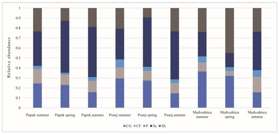 The functional feeding group categories (FFG) in this study were as follows: collector–gatherers (CG), collector–filterers (CF), scrapers (Sc), shredders (Sh), and predators (P). Figure 2 shows the composition of the different functional feeding groups in the different seasons in the streams of three mountains. In the summer season, the dominant groups in the streams of all three mountains were collectors–gatherers and scrapers. In the spring season, scrapers dominated in the streams on Papuk and Psunj, but shredders were the dominant FFG in the streams of Medvednica. In the autumn period, the scrapers dominated again. The redundancy analysis showed a different correspondence of FFGs in the different seasons (Figure 3). Water temperature, streambed width, oxygen saturation, and water hardness were the most influential parameters in summer; in spring, FFGs are related to water hardness, altitude, and conductivity; and in autumn, the most correlated variables were water temperature, streambed width, and water hardness.