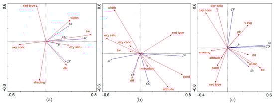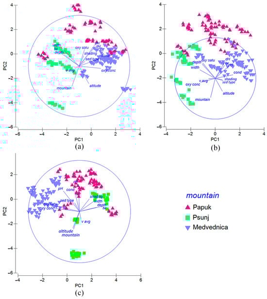 Principal component analysis (PCA) plot of the environmental, hydrological, and morphological variables analyzed at sampling sites in streams on three mountains. Different colors represent different groups of samples located in the mountains: (a) in summer, (b) in spring, and (c) in autumn season. Abbreviations as in Figure 3.