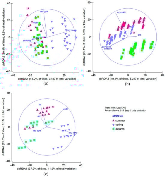 Distance-based redundancy analysis ordination of aquatic insect abundance data showing the relationships between samples and the best correlated environmental, hydrological, and morphological variables affecting the assemblages in different seasons (different symbols and colors correspond to different seasons): (a) abundance of studied streams on Papuk mountain, (b) on Medvednica mountain, (c) on Psunj mountain. Abbreviations as in Figure 3.