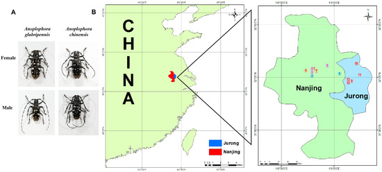 Morphology of female and male Anoplophora glabripennis (ALB) and Anoplophora chinensis (CLB) adults (photo credit: Yadi Deng) (A) and sites for beetle collection in 2023 (B). The numbers in (B) correspond to those in Table 1. Red numbers (1, 7–13) represent the sites where only CLB adults were collected; blue numbers (4 and 6) represent the sites where only ALB adults were collected; Purple numbers (2, 3 and 5) represent the sites where both species were captured.
