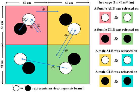Two pairs of female and male ALB adults and two pairs of female and male CLB adults were marked with a spot (~0.5 cm diam.) of different acrylic colors on the middle part of an elytron. The basal parts of elytra were not covered by acrylic colors; thus, the two species can be discriminated by the naked eye. Two females in each species were marked red and green, respectively, and two males in each species were marked yellow and blue, respectively. The beetles with the same color mark were individually released on the branches in a region, and the regions were also labeled by attaching a zip tie (2.8 mm × 200 mm, in the same color with the beetles released) to the flasks. Within a region, the branches with ALBs and CLBs released were marked with white and black acrylic colors on bark, correspondingly. Thus, a cage was divided into multiple discernible parts (shown in Figure 2), which, together with the labeling of beetles, were used to track the beetles’ position shifts (between branches and regions) during the experiment.