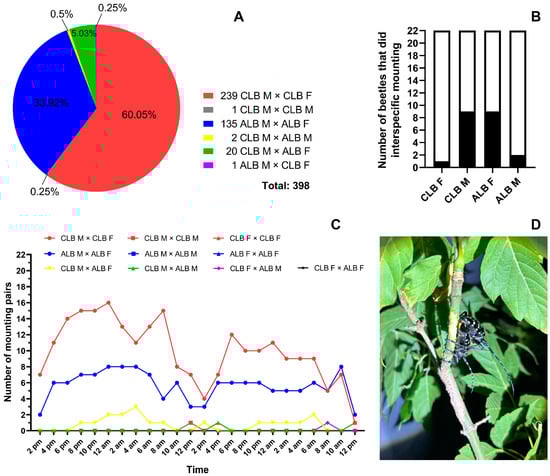 The observed mounting events among the male (M) and female (F) Anoplophora glabripennis (ALB) and Anoplophora chinensis (CLB) in the cages. (A) The proportions (in the pie chart) and numbers (at the lower right corner) of different types of mountings recorded in 24 observations (every 2 h) during 48 h. (B) The numbers of male and female CLB and ALB observed performing interspecific mounting during 48 h. (C) The numbers of different types of mountings observed at each time point during 48 h. (D) A copulation between a pair of beetles (photo credit: Xiaoyuan Chen and Jing Ma).