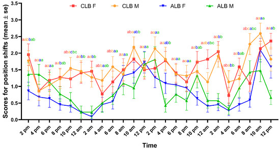 The scores for position shifts of male (M) and female (F) Anoplophora glabripennis (ALB) and Anoplophora chinensis (CLB) in the cages during 48 h. The colors of the lowercase letters above lines correspond to the colors of the lines that represent female (red) and male (orange) CLB, female (blue) and male (green) ALB. Different letters indicate statistically significant differences at the same time point (p < 0.05; Bonferroni adjusted pairwise comparisons following a generalized linear model). See detailed statistical results in Table S1.