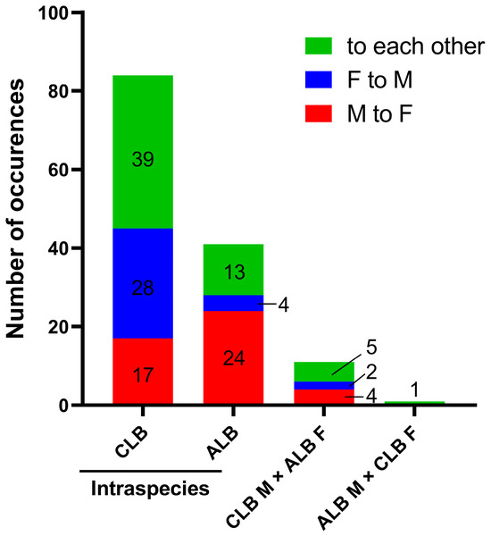 The orientations of beetles potentially for mountings were inferred in 84, 41, 11 and one mounting events between male and female CLBs, male and female ALBs, male CLBs and female ALBs, and male ALBs and female CLBs, respectively. In the intraspecific mountings of CLBs, the orientations of both sexes to each other were the major type (39/84), followed by those of females to males (28/84) and males to females (17/84). However, males likely oriented to females before 24 of 41 ALB intraspecific mountings began, and the orientations of both sexes to each other and females to males were inferred in 13 and four mounting events, respectively. The potential orientations of sexes for intraspecific mountings had statistically significant differences between the two species (Chi-square test: df = 2, χ2 = 19.74, p < 0.001; Figure 5). In the interspecific mountings between male CLBs and female ALBs, five, four and two belonged to the orientations of both sexes to each other, males to females, and females to males, respectively. Both beetles had discernible position shifts for the mounting between a male ALB and a female CLB (Figure 5).