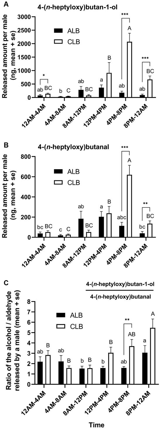 The amounts of male-produced aggregation-sex pheromone components, 4-(n-heptyloxy)butan-1-ol (A), 4-(n-heptyloxy)butanal (B), and the ratios of 4-(n-heptyloxy)butan-1-ol versus 4-(n-heptyloxy)butanal (C), released by male adults of Anoplophora glabripennis (ALB) and Anoplophora chinensis (CLB) in different periods of a day. The lowercase letters and uppercase letters indicate statistically significant differences among different time periods in male ALBs and CLBs, respectively (p < 0.05; Bonferroni adjusted pairwise comparisons following generalized linear model). The asterisk(s) indicate statistically significant differences between species in the same period (* 0.01 < p < 0.05, ** 0.001 ≤ p ≤ 0.01, *** p < 0.001; Mann–Whitney U test). The values for the amounts of 4-(n-heptyloxy)butan-1-ol and 4-(n-heptyloxy)butanal quantified in the volatiles released by male ALBs and CLBs in each period are shown in Tables S2 and S3.