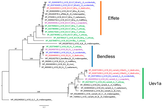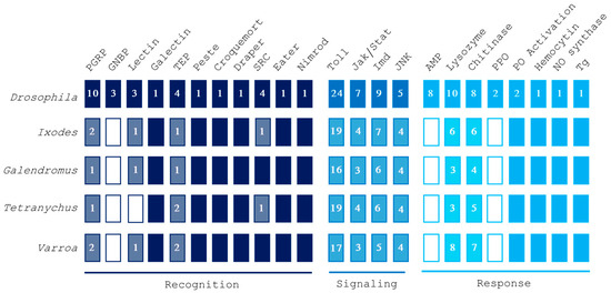 We used a broadly used approach to identify immunity-related genes by inferring protein homology based on sequence similarity through BLASTp searches [44,45]. Immune gene candidates from D. melanogaster, reported in Table 1, Table 2 and Table 3, were used to query the NCBI nr protein database by limiting the target organism to V. destructor, Ixodes scapularis, Galendromus occidentalis, and Tetranychus urticae. Only hits with an E-Value less than 1 × 10−5 were considered positive.