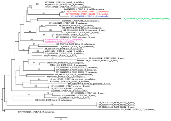 Phylogenetic tree based on maximum likelihood analysis of PGRP putative homologs identified in the genomes of V. destructor (in red), G. occidentalis (in blue), T. urticae (in green), and I. scapularis (in purple). The longest branch of the unrooted tree is used as the outgroup. Bootstrap support values > 50% are indicated at each node. The scale bar indicates the number of amino acid substitutions per site.