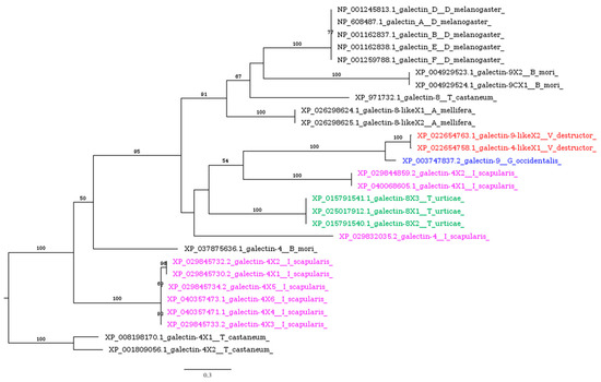Galectins, a widely prevalent family of lectins [66], exhibiting thiol group-dependent activity and present in both intracellular and extracellular spaces [67], are upregulated in mosquitoes upon exposure to bacterial infections as well as malaria parasite invasion [68]. Galectins present in the gut of the hematophagous sand fly Phlebotomus papatasi facilitate a specific interaction between the insect’s midgut and Leishmania major, a critical event for parasite survival, and play a role in determining species-specific vector competence [69]. More broadly, insect galectins are believed to participate in pathogen recognition, agglutination, and phagocytosis [66,70]. Variability in galectin transcripts across different insect species has been highlighted by genome-wide studies: 5 transcripts were identified in Drosophila melanogaster, 8 in Anopheles gambiae, and 12 in Aedes aegypti [71], with 4 identified in several Lepidoptera species [72]. Acarina species (Tables S1–S3), including V. destructor, possess putative homologs of galectins (Table 1). Notably, I. scapularis shows a significant expansion of galectins, compared to the other target species, which have diversified into three distinct clusters (Figure 3).