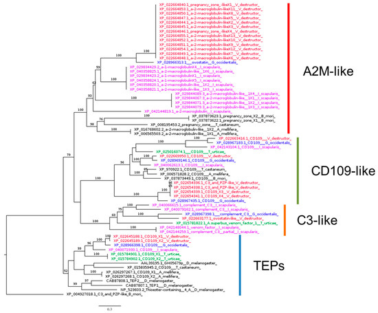 Our phylogenetic analysis revealed a distinct clustering of A2M, CD109, and C3 homologs (Figure 4). All Acarina species investigated had at least one representative in each cluster, except for T. urticae, which lacks putative homologs of A2M. Notably, the best BLASTp hits of Drosophila TEP1, TEP2, TEP3, and TEP4 in the V. destructor genome are two isoforms of the same gene (Table 1).