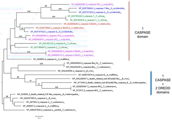 Alignments were automatically trimmed using Gblocks version 0.91b [49] to avoid comparisons of non-conserved regions present only in a subset of the taxa. The best-fit model of amino acid substitution and phylogenetic reconstruction was generated using RAxML 8.2.12 [50]. The maximum likelihood tree was run for 1000 bootstrap replicates and the tree figure was plotted using FigTree v1.4.3. Protein sequences were analyzed with ScanProsite (https://prosite.expasy.org/scanprosite/, accessed on 5 November 2024) and InterProScan [51], in order to identify active sites, conserved patterns, and domains [52]. For PGRPs, we scanned putative homologs for transmembrane helices using DeepTMHMM, which predicts alpha and beta transmembrane proteins using deep neural networks [53].