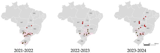 During three consecutive soybean growing seasons (2021/22, 2022/23, and 2023/24), loopers were sampled in 91 geographically distinct soybean fields in Brazil, containing non-Bt (Roundup Ready—RR), Cry1Ac (MON 87701 × MON 89788), and Cry1Ac × Cry1F (DAS-81419-2 × DAS-444Ø6-6) technologies. Collections were carried out at random locations based on the presence of looper larvae in soybean fields. There were 23 fields in 2021/22, 30 in 2022/23, and 38 in 2023/24 (Table S1).