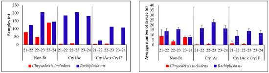 Proportion (left) and number (right) of Rachiplusia nu and Chrysodeixis includens individuals sampled during the 2021/22, 2022/23, and 2023/24 seasons in Non-Bt, Cry1Ac, and Cry1Ac × Cry1F soybean fields in Brazil. Vertical bars represent standard errors of the mean values.